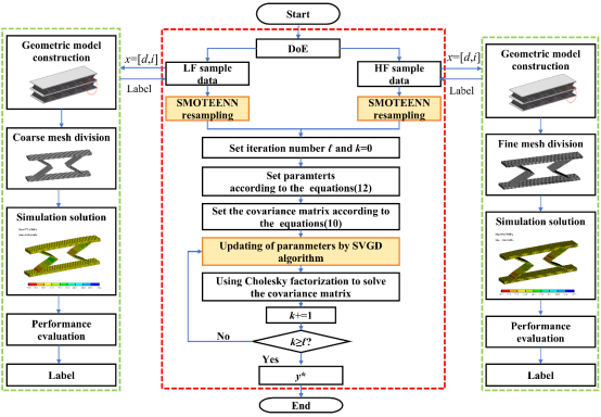 近日,华体会平台机械工程学院何有为博士团队在计算机科学领域中科院一区top期刊Engineering Applications of Artificial Intelligence上发表了题为“An efficient boundary prediction method based on multi-fidelity Gaussian classification process for class-imbalance”的研究论文。该论文介绍了一种基于多保真度高斯分类过程的边界预测方法,旨在利用多保真度建模范式降低边界预测模型的建模代价和提升类不平衡时边界预测模型的建模精度。研究生刘凌志和谈宽为参与作者,何有为博士为通讯作者,华体会平台机械工程学院为论文署名单位。边界预测是工程设计过程中不可避免的问题,失效与安全极限状态之间的这类边界预测是其中最热门的研究课题之一。囿于物理实验成本高昂、周期长的局限性,基于代理模型的边界预测方法常被用于边界的快速预测。在众多代理模型中,高斯分类过程(GPC)被广泛使用。但是,其仅可利用获取代价高昂的高可信度数据,导致建模数据的获取代价高昂。为降低建模数据获取代价,基于多可信度建模范式发展了多可信度高斯分类过程(MGPC)。它使用大量的廉价低可信度样本点来捕捉工程系统的整体趋势,进一步使用少量昂贵高可信度样本点对其进行校正,从而在保证较高建模精度的同时降低模型时间。其次,现有GPC主要利用马尔可夫链蒙特卡洛采样(MCMC)方法开展模型训练,导致其建模过程计算量大且收敛速度较慢。为此,提出了基于斯坦因变分梯度下降(SVGD)训练方法的改进MGPC模型(MGPC-SVGD)。再次,在工程边界预测问题中,MGPC还会受到因样本点难以获取或边界划分不均匀等诱发的类别不平衡现象,对模型精度造成损害。针对该问题,植入了合成少数类过采样方法与编辑最近邻耦合的混合采样方法,降低建模数据的类不平衡率,建立了基于MGPC的边界预测方法,流程如下图所示。