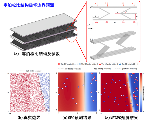 将所提方法应用于近零泊松比结构的失效边界和压气机转子安全运行边界的预测。预测结果如下两图显示。所提方法的建模精度和速度均优于现有模型,验证了所发展方法的有效性和工程实用性。所提方法还能为多可信度贝叶斯优化算法提供新型的可行域边界预测途径。
