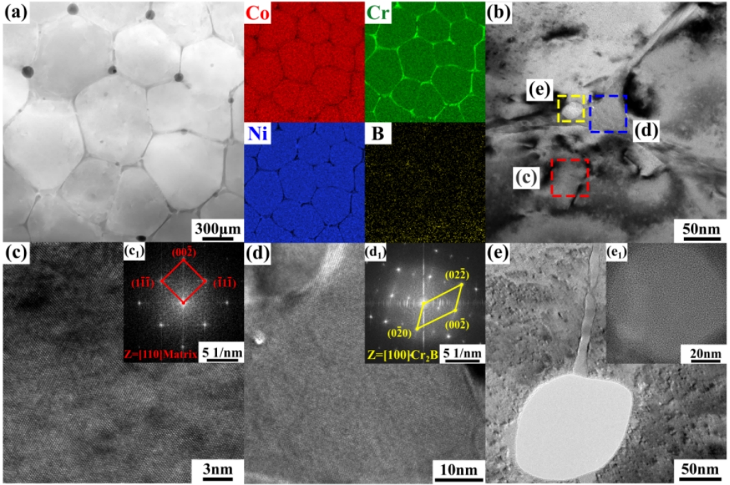 图2 采用LPBF制备的CCN-0.8B合金的TEM图和相应元素分布图:(a)相应区域的明场像和元素分布;(b) Cr2B/基体界面的HR-TEM图;(c-c1)基体的HR-TEM图和FFT图;(d-d1) Cr2B的HR-TEM图和FFT图;以及(e-e1)富B沉淀相的HR-TEM图和FFT图