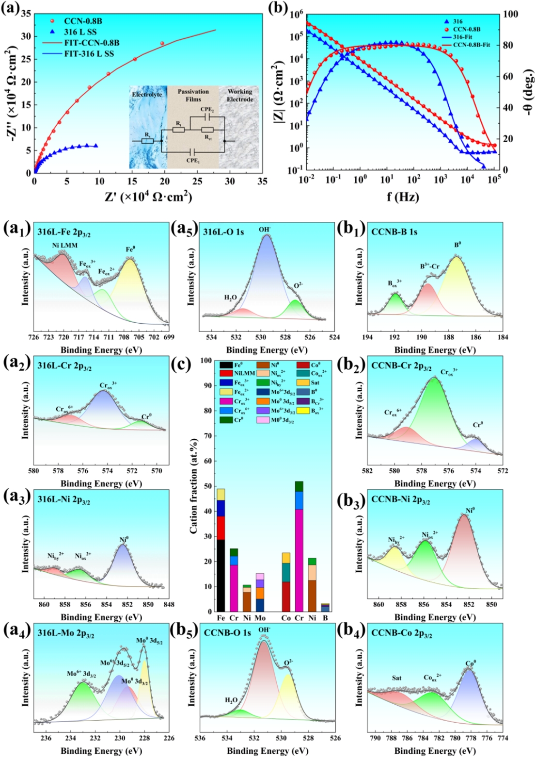 图4(a-b)采用LPBF制备的CCN-0.8B和316L SS在3.5 wt. %NaCl溶液的电化学阻抗谱(EIS)结果;(a1-a5)高分辨率XPS对316 L SS形成的钝化膜的成分定量分析;(b1-b5)高分辨率XPS对CCN-0.8B形成的钝化膜的成分定量分析
