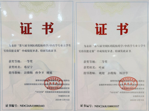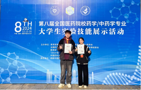 近日,第八届全国医药院校药学/中药学专业大学生实验技能竞赛决赛在成都中医药大学落下帷幕。经过激烈的角逐,华体会平台药学院2021级药学专业的蔡星宇和叶雨同学发挥出色,分别获得一等奖和二等奖,创下历年来最佳赛绩。